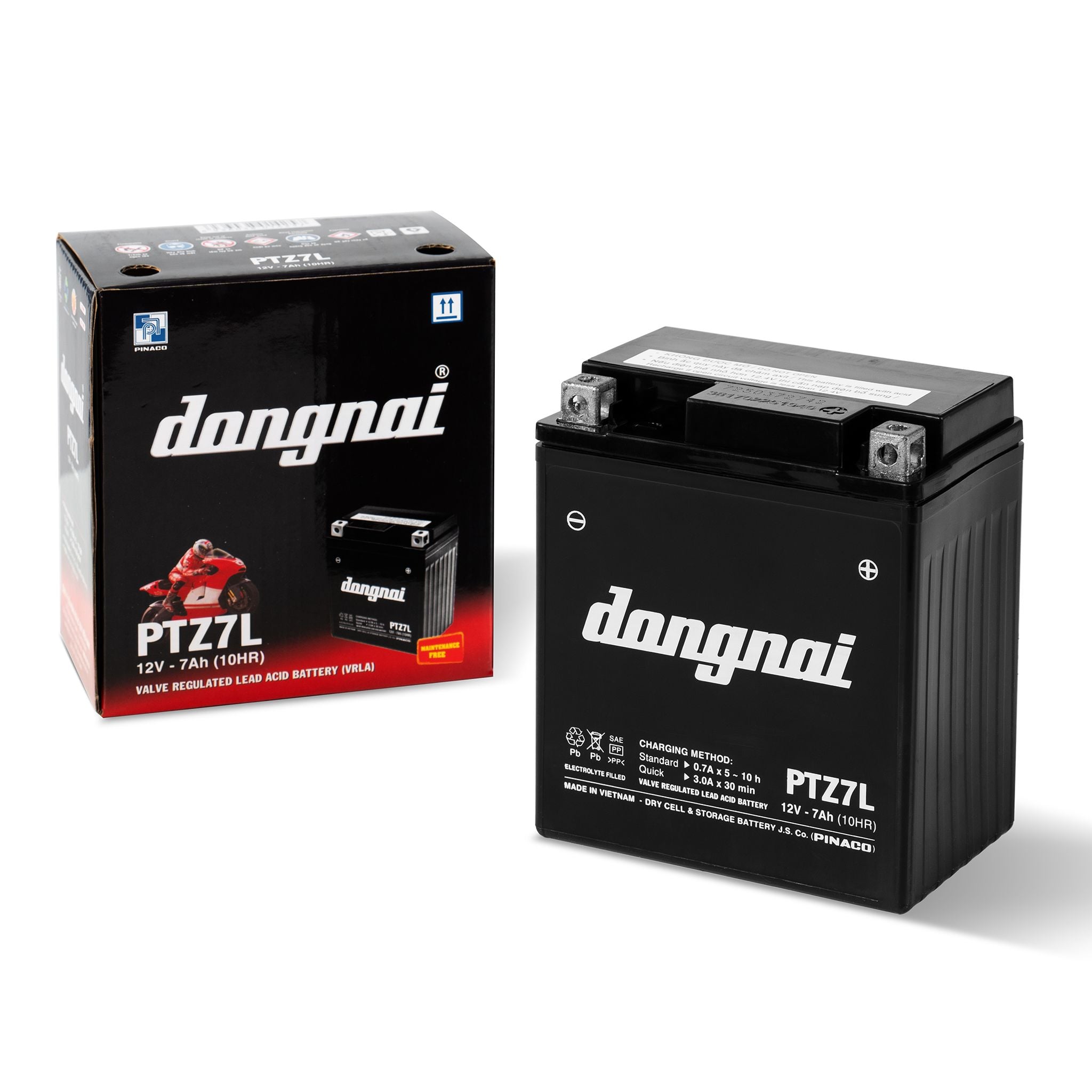Ắc quy Đồng Nai PTZ7L là dòng ắc quy khô xe máy 12V 7Ah do PINACO sản xuất tại Việt Nam. Sản phẩm ứng dụng công nghệ VRLA (Valve Regulated Lead Acid) giúp bình hoạt động kín khí, an toàn và miễn bảo dưỡng hoàn toàn trong suốt quá trình sử dụng.