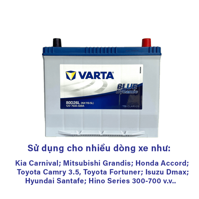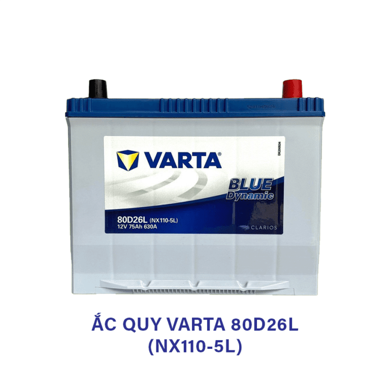 Trong đó, ắc quy Varta 80D26L (NX110-5L) 12V 75Ah được thiết kế cho các dòng xe có nhu cầu điện lớn và ổn định. Với dòng khởi động lạnh CCA 630A, bình giúp xe đề nổ nhanh, hạn chế tình trạng yếu điện khi vận hành điều hòa, hệ thống giải trí hoặc khi xe chạy đường dài.