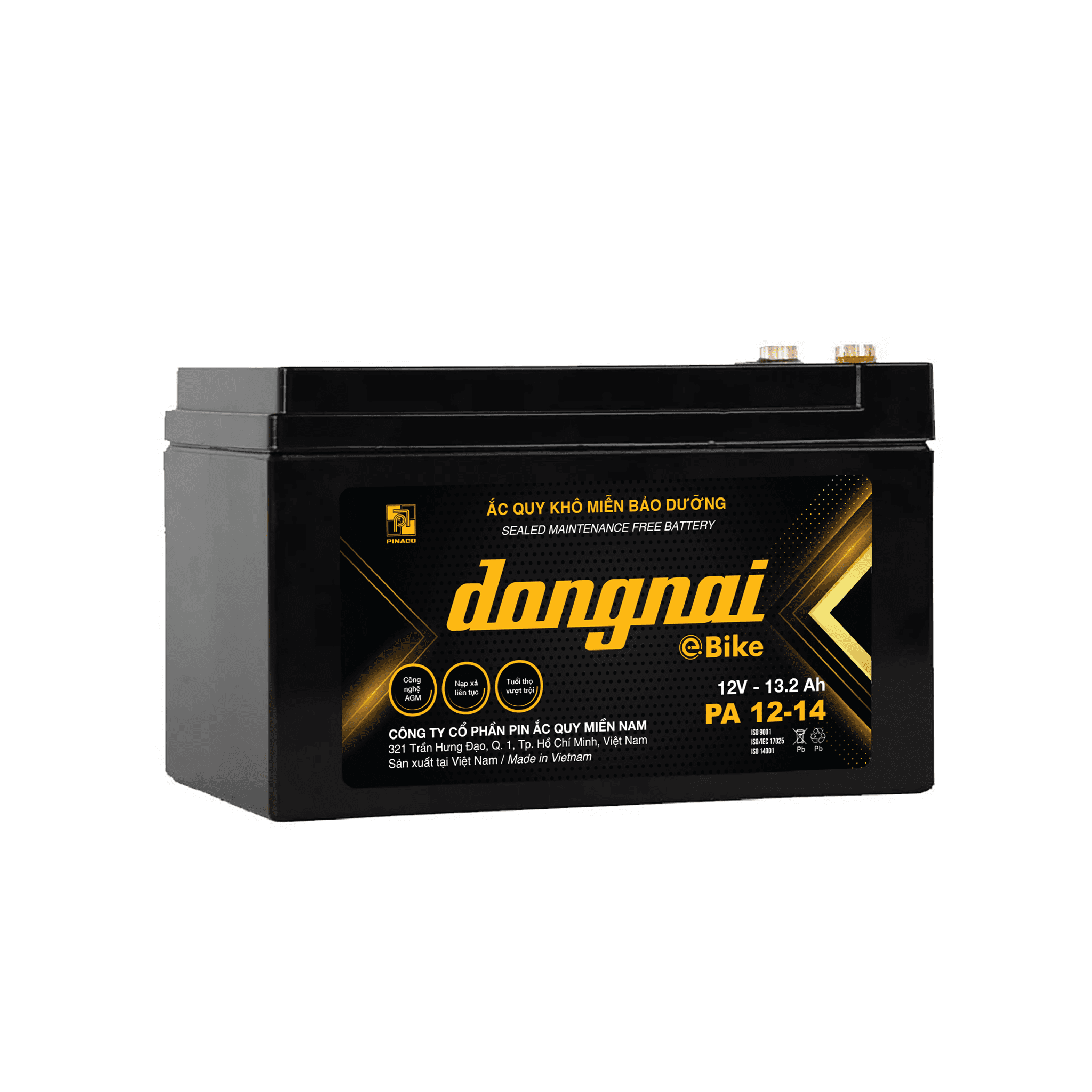 Ắc quy xe đạp điện Đồng Nai PA 12-14 là dòng ắc quy khô Đồng Nai 14Ah do PINACO sản xuất, sử dụng công nghệ Sealed Lead Acid (SLA) kín khí, giúp bình miễn bảo dưỡng hoàn toàn, an toàn khi sử dụng trong không gian kín.